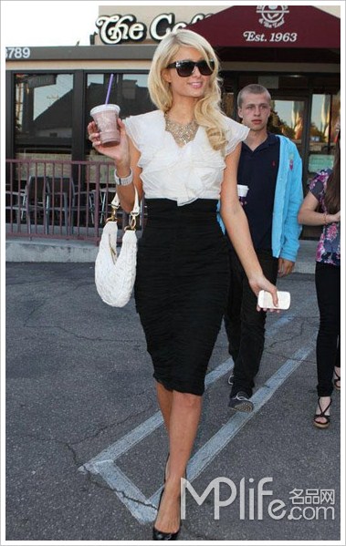 荷叶边的雪纺衬衣也许太过于甜美,黑色的窄身中裙不仅让整体变得更加稳重,而且提高腰线,彰显希尔顿完美的曲线!