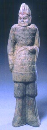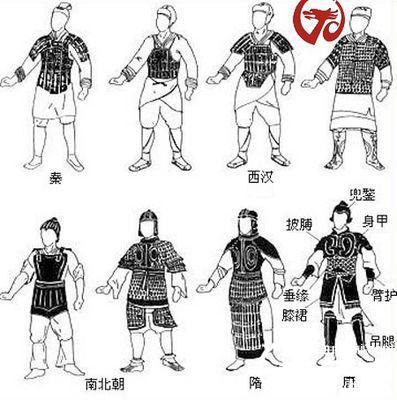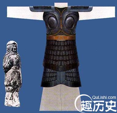 秦代兵士铠甲。这是秦兵俑中最为常见的铠甲样式,是普通战士的装束,这类铠甲有如下特点,胸部的甲片都是上片压下片,腹部的甲片,都是下片压上片,以便于活动。从胸腹正中的中线来看,所有甲片都由中间向两侧叠压,肩部甲片的组合与腹部相同。在肩部、腹部和颈下周围的甲片都用连甲带连接,所有甲片上都有甲钉,其数或二或三或四不等,最多者不超过六枚。甲衣的长度,前后相等。皆为64厘米,其下摆一般多呈圆形,周围不另施边缘。