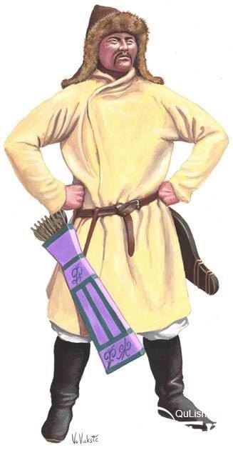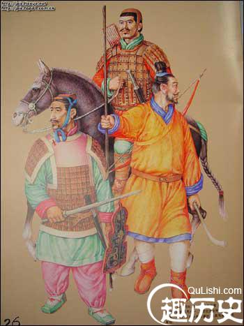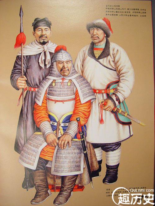 元武士元代铠甲有柳叶甲、有铁罗圈甲等。铁罗圈甲内层用牛皮制成,外层为铁网甲,甲片相连如鱼鳞,箭不能穿透,制作极为精巧。另外还有皮甲、布面甲等。戎服只有一种本民族的服饰,即质孙服,样式为紧身窄袖的袍服,有交领和方领、长和短两种,长的至膝下,短的仅及膝。还有一种辫线袄与质孙服完全相同,只是下摆宽大、折有密裥,另在腰部缝以辫线制成的宽阔围腰,有的还钉有钮扣,俗称“辫线袄子”,或称“腰线袄子”。这种服装也是元代的蒙古戎服,军队的将校和宫廷的侍卫、武士都可服用