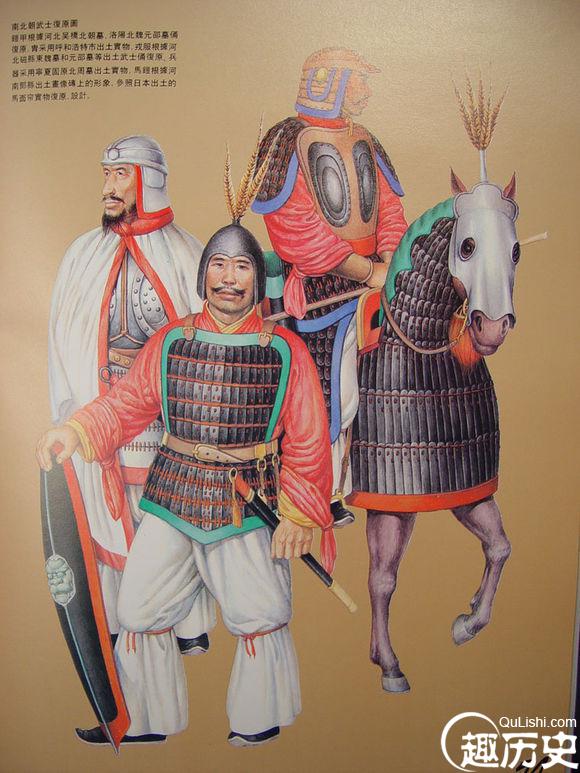魏晋时期军戎服饰复原图。左侧为铁制筒袖铠,是一种胸背相连、短袖,用鱼鳞性甲片编缀而成,筒袖铠的外形与西汉的铁铠很相似,从头上套穿,这种筒袖铠坚硬无比。胄基本沿袭东汉的形制,胄顶高高地竖有缨饰。右侧为魏晋时期的戎服,主要是袍和裤褶服。袍长及膝下,宽袖。褶短至两胯,紧身小袖,袍、褶一般都为交直领,右衽,但也有圆领。