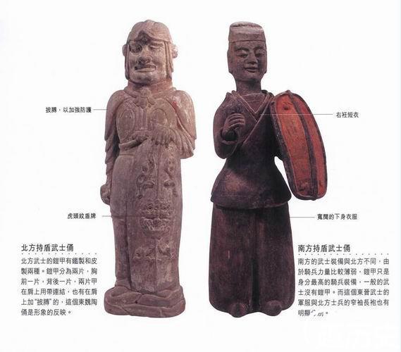 魏晋北朝时期的铠甲主要有筩袖铠两、裆铠和明光铠。“明光铠”一词的来源,据说与胸前和背后的圆护有关。因为这种圆护大多以铜铁等金属制成,并且打磨的极光,颇似镜子。在战场上穿明光铠,由于太阳的照射,将会发出耀眼的“明光”,故名。这种铠甲的样式很多,而且繁简不一:有的只是在裲裆的基础上前后各加两块圆护,有的则装有护肩、护膝,复杂的还有数重护肩。身甲大多长至臀部,腰间用皮带系束。左面陶俑是戴兜鍪、穿明光铠的武将;右面是明光铠穿戴展示图。
