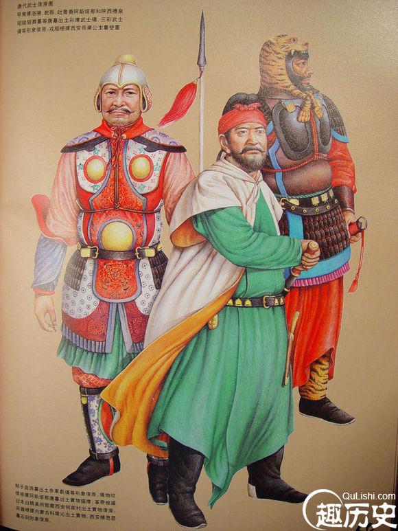 图为唐代穿明光甲及戎服的武士复原图。初唐的铠甲和戎服的基本保持着南北朝以来至隋代的样式和形制。贞观以后,进行了一系列服饰制度的改革,渐渐形成了具有唐代风格的军戎服饰。高宗、则天两朝,国力鼎盛,天下承平,上层集团奢侈之风日趋严重,戎服和铠甲的大部分脱离了使用的功能,演变成为美观豪华,以装饰为主的礼仪服饰。