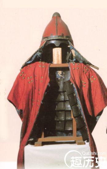 战国武士复原图。战国皮甲,多以犀牛、鲨鱼等皮革制成,上施彩绘;皮甲由甲身、甲袖和甲裙组成;甲片的编缀方法,横向均左片压右片,纵向均为下排压上排;胄也是用十八片甲片编缀起来的。另外,铁甲出现于战国中期,它的前身为青铜甲,是一种比较简单的兽面壮胸甲。战国时期的铁甲通常以铁片制成鱼鳞或柳叶形状的甲片,经过穿组联缀而成。