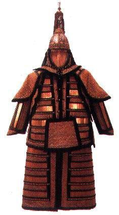 据《辽史》记载,辽在契丹国时,军队就已使用铠甲,主要采用的是唐末五代和宋的样式,以宋为主。铠甲的上部结构与宋代完全相同,只有腿裙明显比宋代的短,前后两块方形的鹘尾甲覆盖于腿裙之上,则保持了唐末五代的特点。铠甲护腹好象都用皮带吊挂在腹前,然后用腰带固定,这一点与宋代的皮甲相同,而胸前正中的大型圆护,是辽代特有的。辽代除用铁甲外也使用皮甲。契丹族的武官服装分为公服和常服两种,样式没有明显不同,都是盘领、窄袖长袍,与一般男子服饰相同,可能常服比官服略紧身一些。这两种都可作戎服。