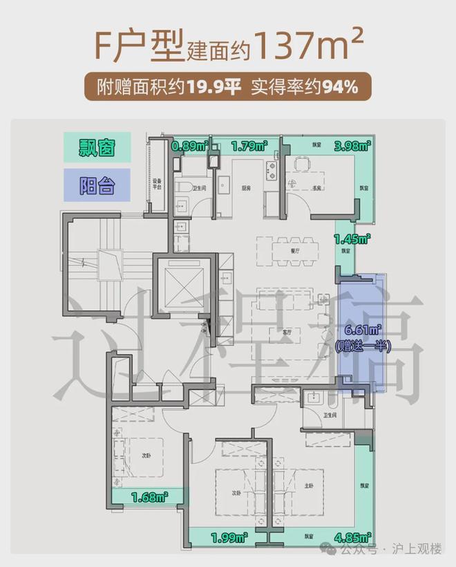 全屋7飘窗+半封阳台,赠送面积近20㎡,实得率约94%。20㎡,都相当于一个豪华主卧那么大了。