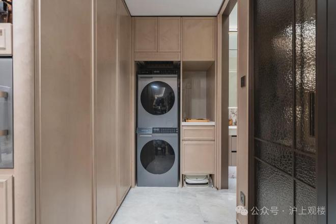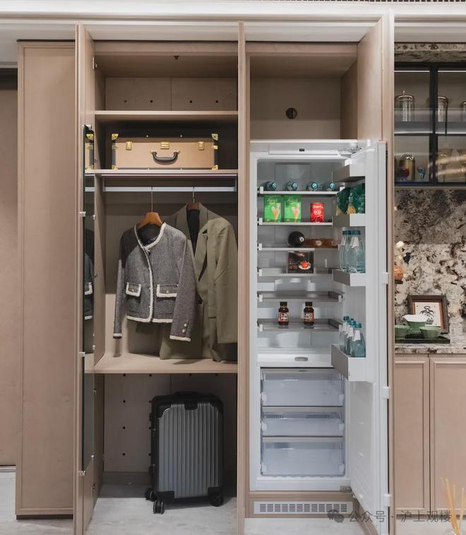 进门还设置一整排收纳柜,衣服、鞋子、行李箱等各种家用物品统统安排妥帖。就连冰箱柜也隐藏其中,整体空间和谐统一。