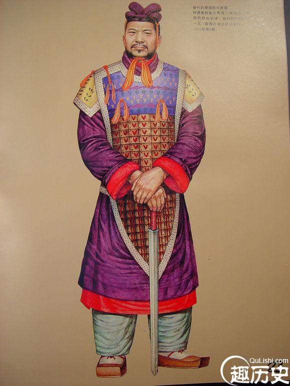 战国武士复原图。战国皮甲,多以犀牛、鲨鱼等皮革制成,上施彩绘;皮甲由甲身、甲袖和甲裙组成;甲片的编缀方法,横向均左片压右片,纵向均为下排压上排;胄也是用十八片甲片编缀起来的。另外,铁甲出现于战国中期,它的前身为青铜甲,是一种比较简单的兽面壮胸甲。战国时期的铁甲通常以铁片制成鱼鳞或柳叶形状的甲片,经过穿组联缀而成。