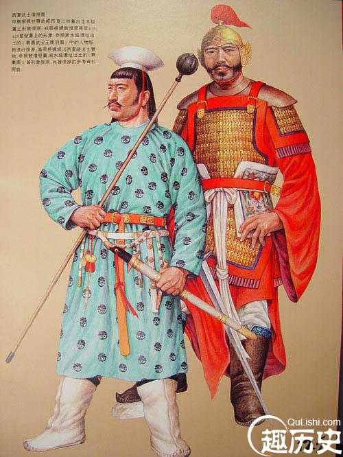 武士所穿铠甲为全身披挂,盔、披膊与宋代完全相同,身甲好象两裆甲,长及膝上,还是以短甲为主说明铠甲的制造毕竟比中原地区落后一些。西夏的官服为也可作戎服,如辽代的契丹服一样,两者明显差别。由于西夏社会的封建程度不是很深,人与人之间的关系还是比较平等,以此在服饰上的等级观念不那么强。