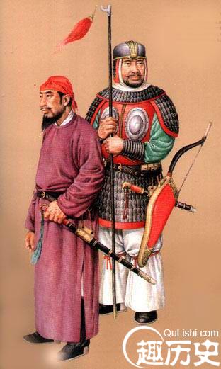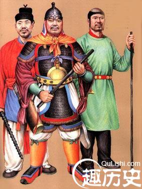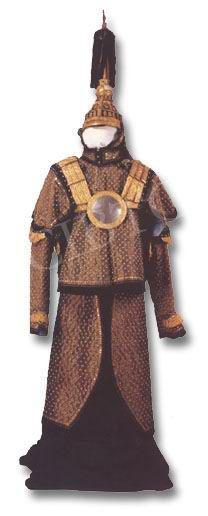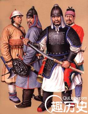 元武士元代铠甲有柳叶甲、有铁罗圈甲等。铁罗圈甲内层用牛皮制成,外层为铁网甲,甲片相连如鱼鳞,箭不能穿透,制作极为精巧。另外还有皮甲、布面甲等。戎服只有一种本民族的服饰,即质孙服,样式为紧身窄袖的袍服,有交领和方领、长和短两种,长的至膝下,短的仅及膝。还有一种辫线袄与质孙服完全相同,只是下摆宽大、折有密裥,另在腰部缝以辫线制成的宽阔围腰,有的还钉有钮扣,俗称“辫线袄子”,或称“腰线袄子”。这种服装也是元代的蒙古戎服,军队的将校和宫廷的侍卫、武士都可服用