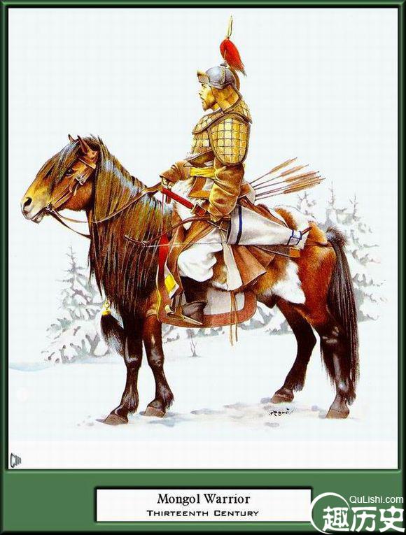 蒙古骑兵蒙古汗国和元代军戎服饰以精巧著名。蒙古高原毡帐诸部未被成吉思汗统一之前曾用过鲛鱼皮甲胄、翎根甲,后来则用以牛皮为里的铜铁盔甲。在彼德堡宫中藏有蒙古骑士遗存的甲胄,内层皆以牛皮为之,外层则满挂铁甲,甲片相连如鱼鳞,箭不能穿。在描自元代居庸关瀛台上的浮雕中就有罗圈甲、鱼鳞甲和柳叶甲。《黑鞑事略》:其军器,有柳叶甲、有罗圈甲(革六重),有顽羊角弓,有响箭,有驼骨箭。 关于蒙古骑兵的精良的军器装备,在有关历史文献中以及有关元代出土文物均有明确记载。据普兰诺.加宾尼记述,蒙古骑兵装备有:2至3张弓、3个装满了箭的巨大箭袋、一把斧,还要带拖兵器的绳子。领兵者要挎一种其尖端尖锐但只有一面有刃的弯刀,将其装在精美的刀鞘里。他们所骑的马均有护身甲,有些兵士的马也有护身甲。马匹的护身甲由5个部分组成,在马的两侧 各有一片甲,一直盖到马头;另一片甲放在马的臀部,和两侧的甲片系结起来,这片甲片上留一个洞,以便马尾从洞里伸出来;另一片甲在马的胸部。在马额上他们放一块铁板,把它系结在两侧的甲片上。