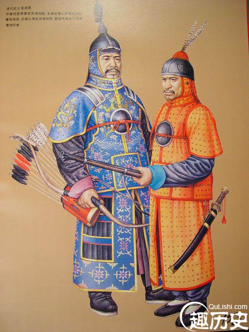 清代一般的盔帽,无论是用铁或用皮革制品,都在表面髹漆。盔帽前后左右各有一梁,额前正中突出一块遮眉,其上有舞擎及覆碗,碗上有形似酒盅的盔盘,盔盘中间竖有一根插缨枪、雕翎或獭尾用的铁或铜管。后垂石青等色的丝绸护领,护颈及护耳,上绣有纹样,并缀以铜或铁泡钉。铠甲分甲衣和围裳。甲衣肩上装有护肩,护肩下有护腋;另在胸前和背后个佩一块金属的护心镜,镜下前襟的接缝处另佩一块梯形护腹,名叫“前挡”。腰间左侧佩“左挡”,右侧不佩挡,留作佩弓箭囊等用。围裳分为左、右两幅,穿时用带系于腰间。在两幅围裳之间正中处,覆有质料相同的虎头蔽膝。此图为清代黄缎铜钉铜叶甲,但没有护心镜。